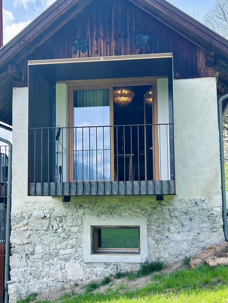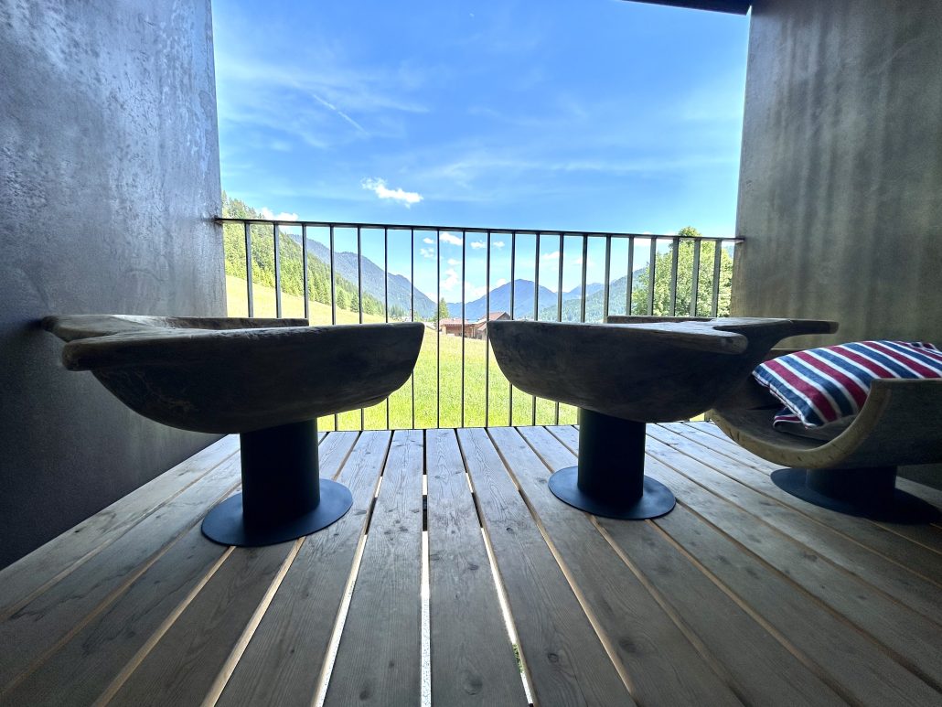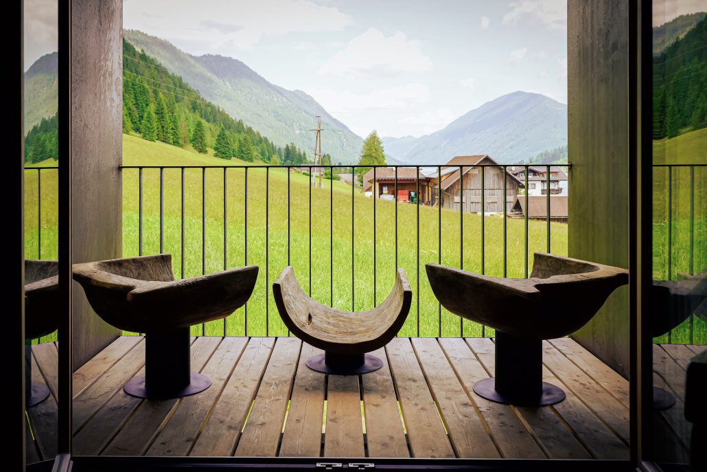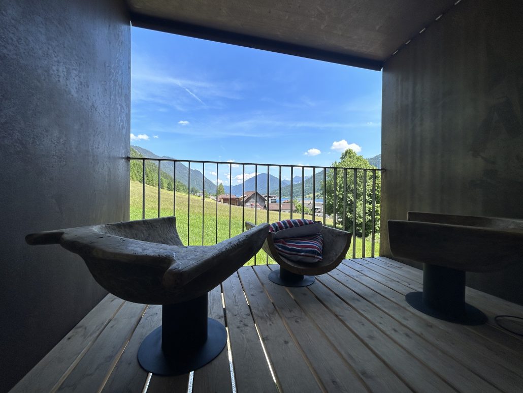 Framed between weathered steel plates and defined by vertical iron balustrades, it becomes an architectural aperture toward meadows, forest edges, and the shimmering Lake Weissensee.