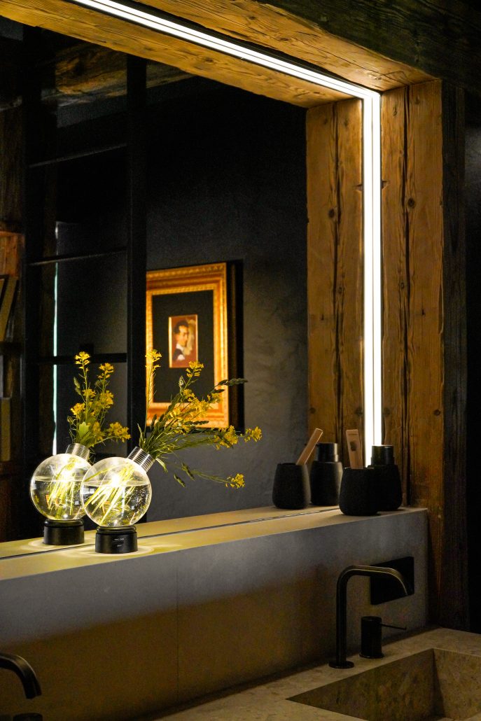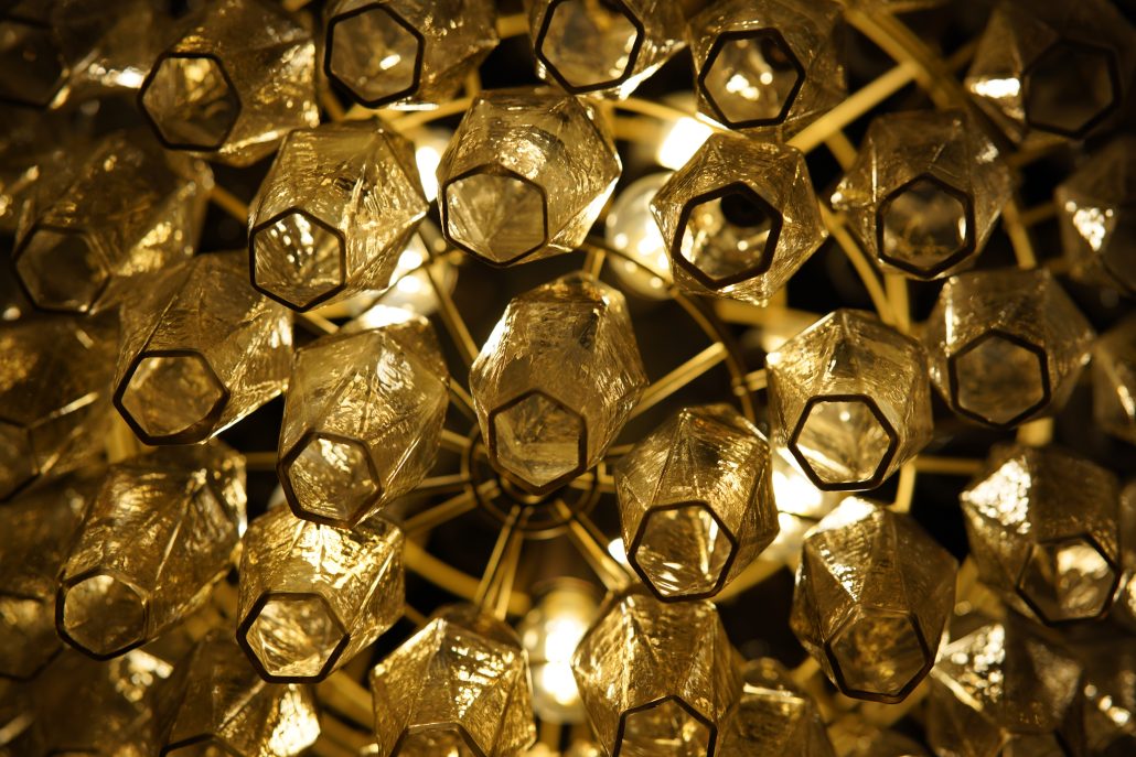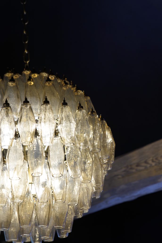 Above, a vintage Murano “Poliedri” chandelier (circa 1978) floats like a suspended constellation. Its hand-blown glass prisms diffuse a warm, amber glow across the dark surfaces, softening the space with a poetic luminosity.