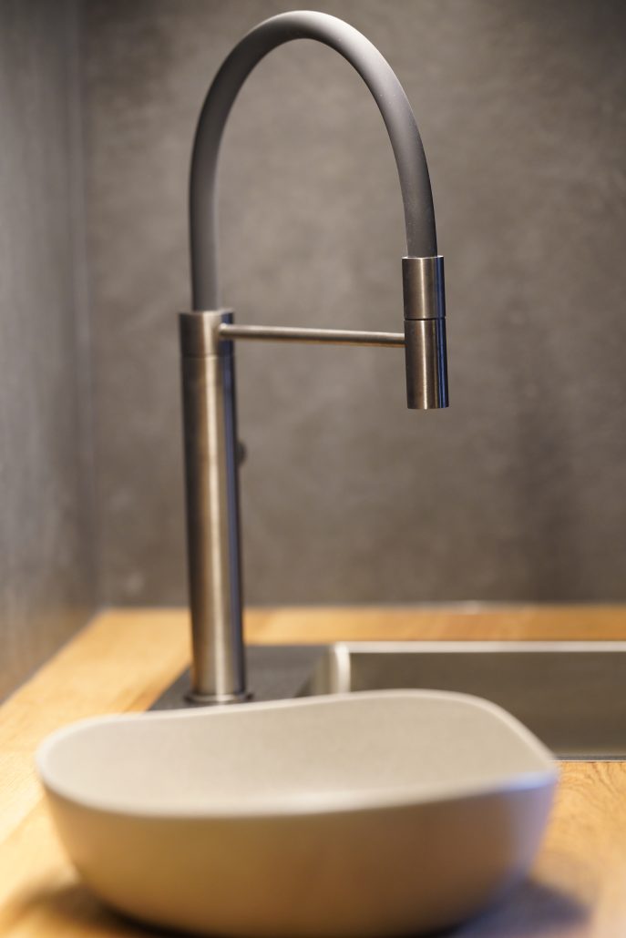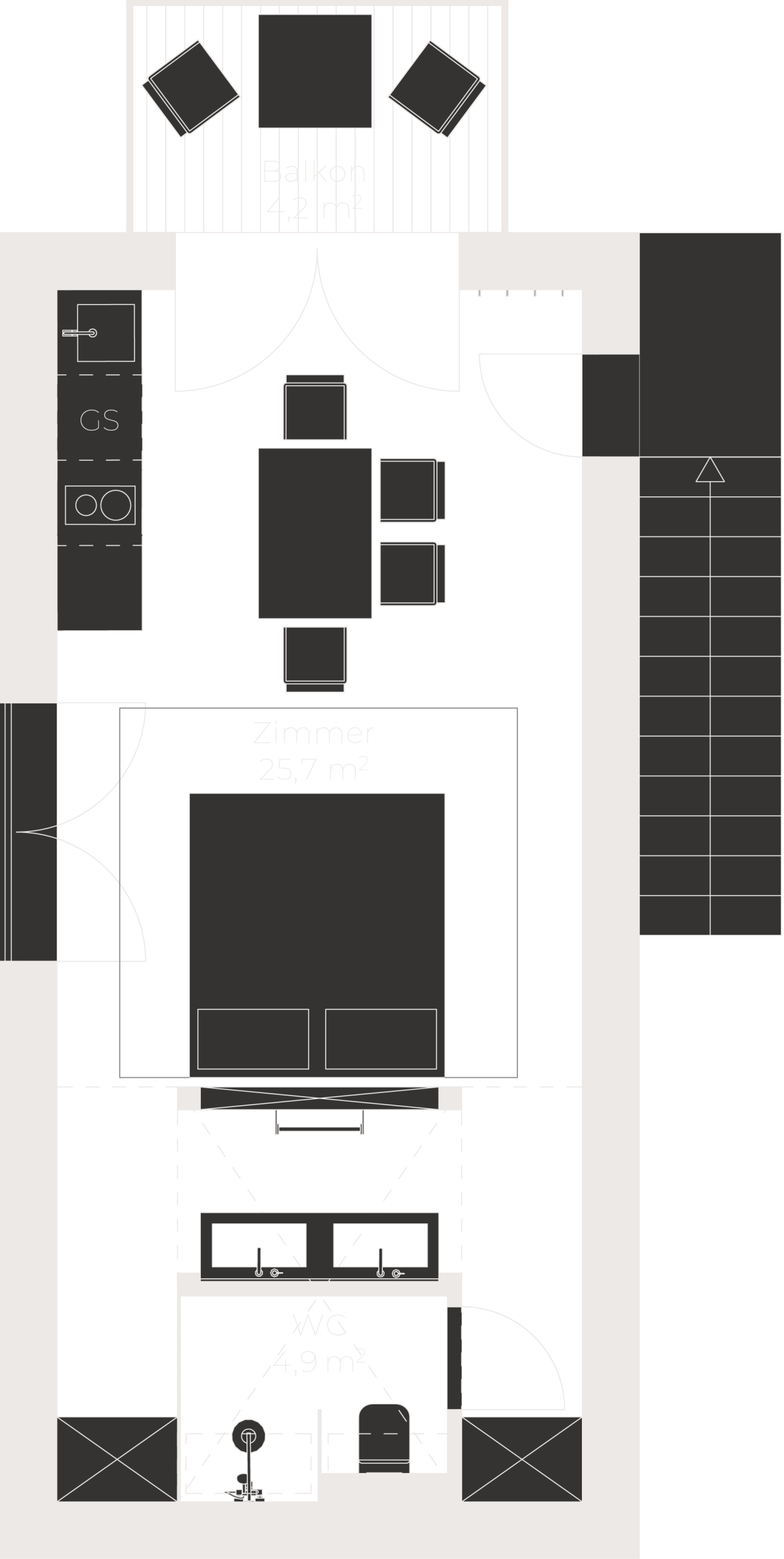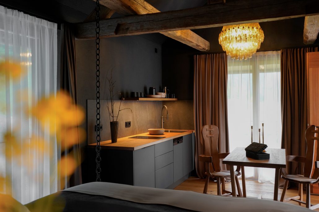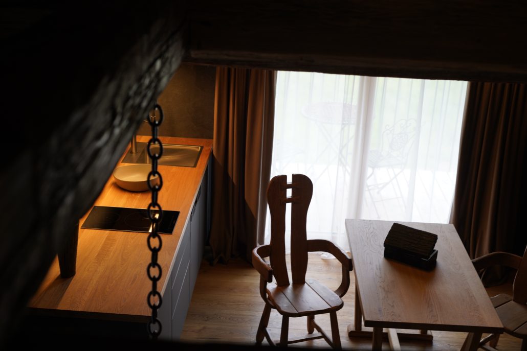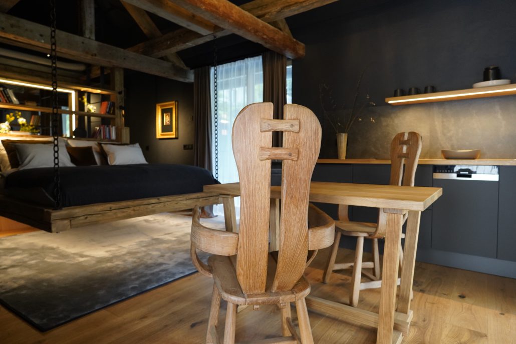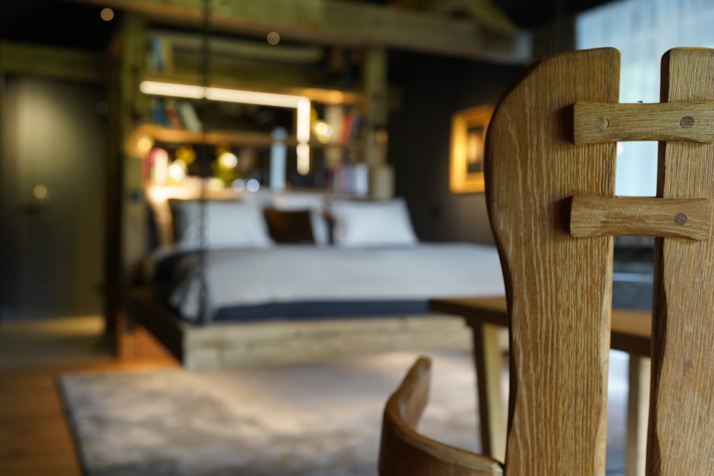 A finely crafted staircase rises toward the mezzanine sleeping gallery above — a second, quiet layer of rest — allowing two additional guests to be accommodated without disrupting the openness and visual calm of the studio below.