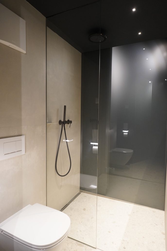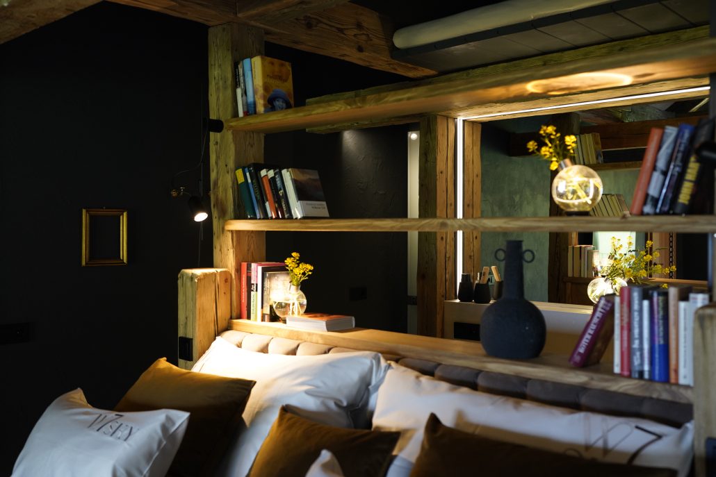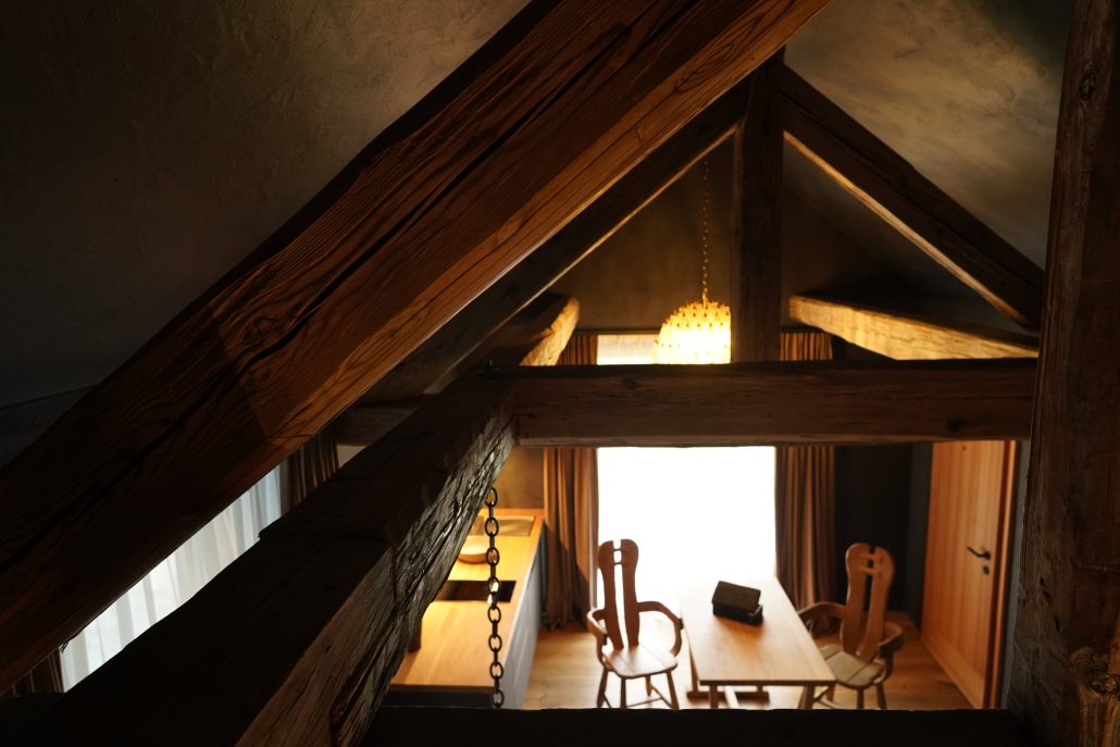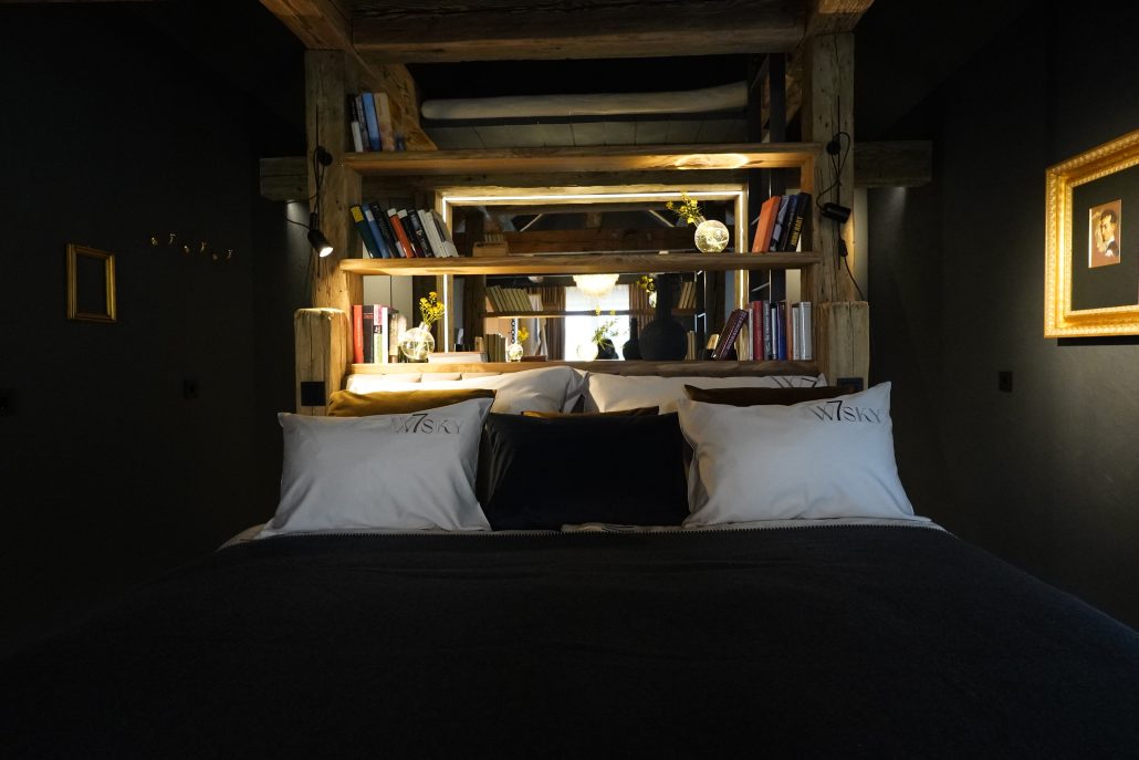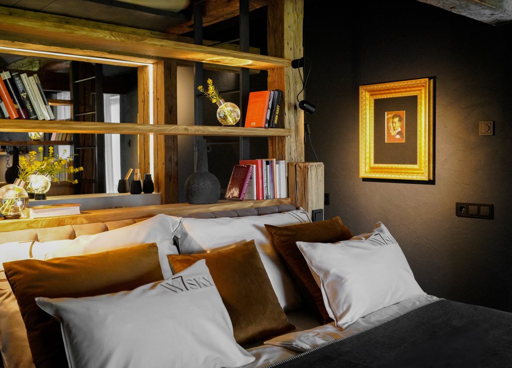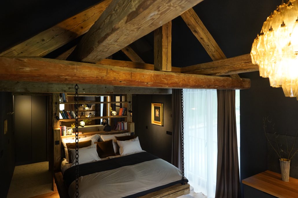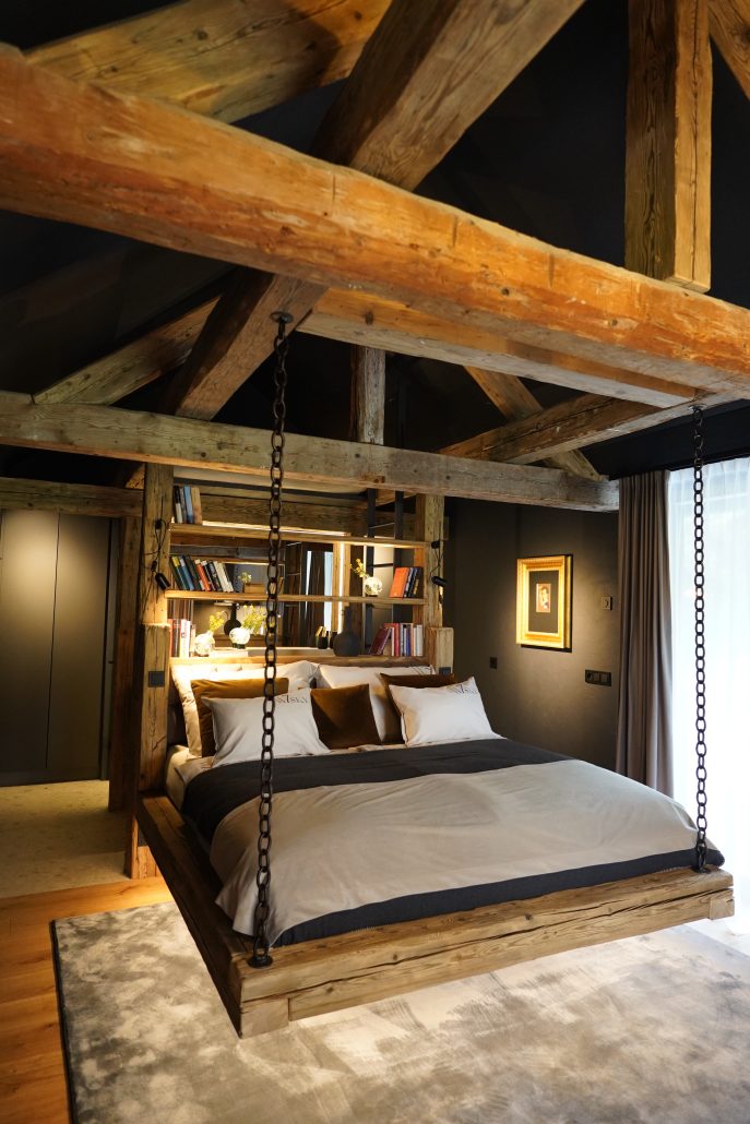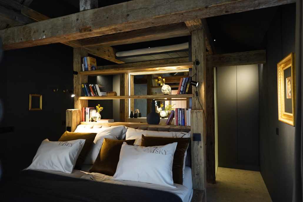 A discreet entrance guides you into the main living and sleeping area, defined by generous ceiling height and exposed roof beams that lend architectural weight and a feeling of shelter. To one side, a subtle corridor connects the wardrobe and bathroom, preserving privacy and spatial flow.