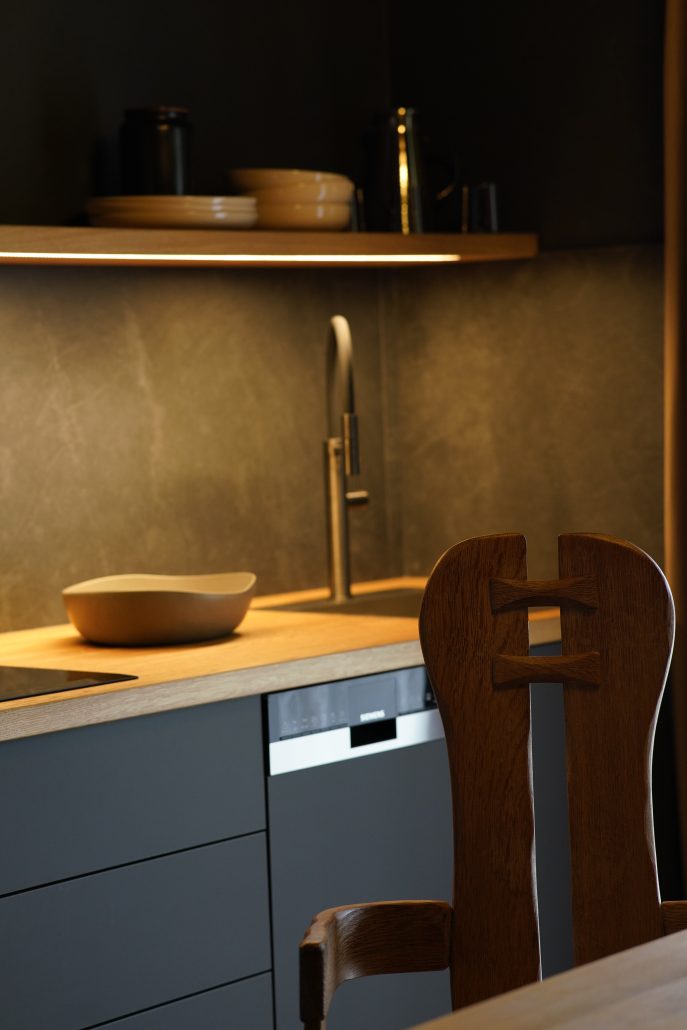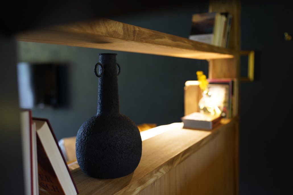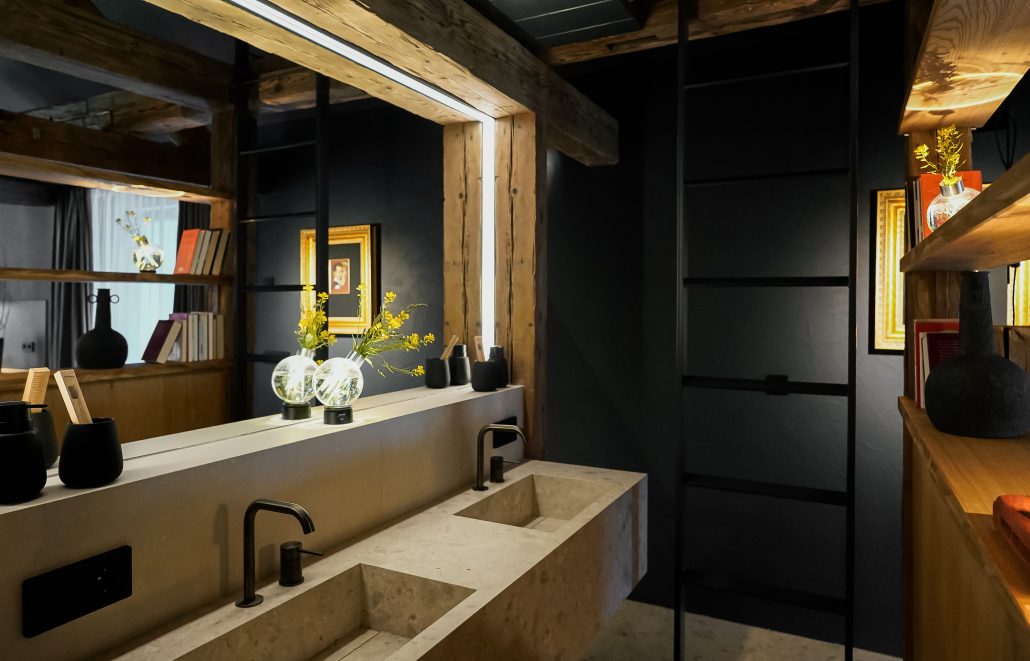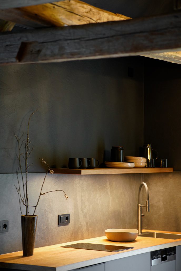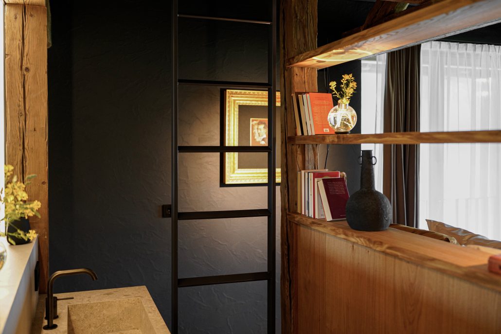 Thoughtful, intimate, and sculptural, the space reads like a visual poem: dark, textured walls softened by natural light; raw materials balanced by artisanal detail; a quiet sense of stillness carried through every corner.
