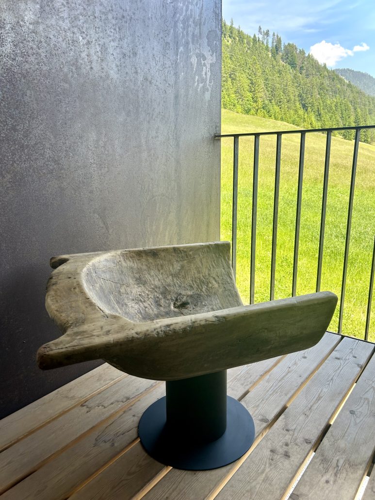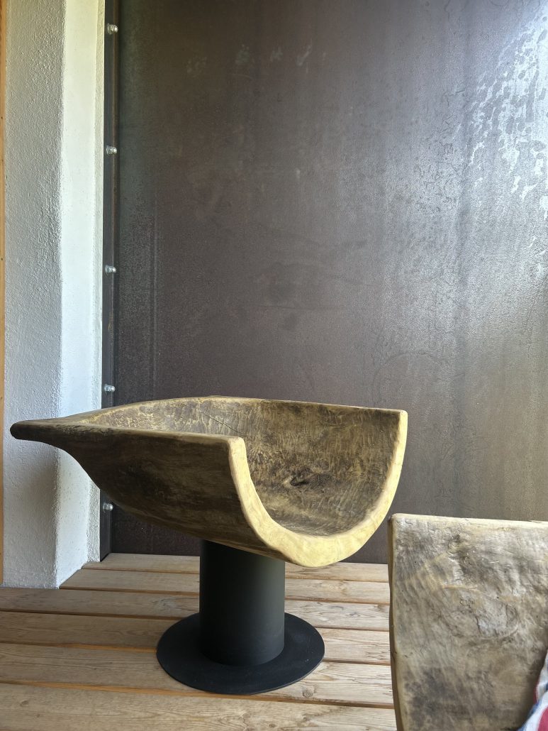 Here, a trio of hand-carved sculptural bowl chairs rests on black steel pedestals — organic hollowed forms contrasting with the rigid metal frame. Quietly ritualistic, they invite slow conversations, motionless gazes, and long pauses.