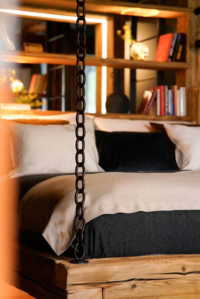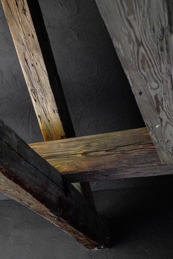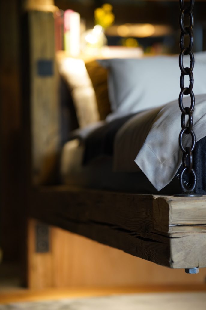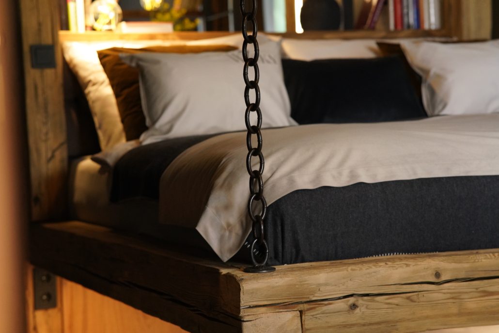 Framed with massive reclaimed wooden beams and suspended by custom-forged steel chains, it carries both weight and levitation — a quiet tension between gravity and lightness.